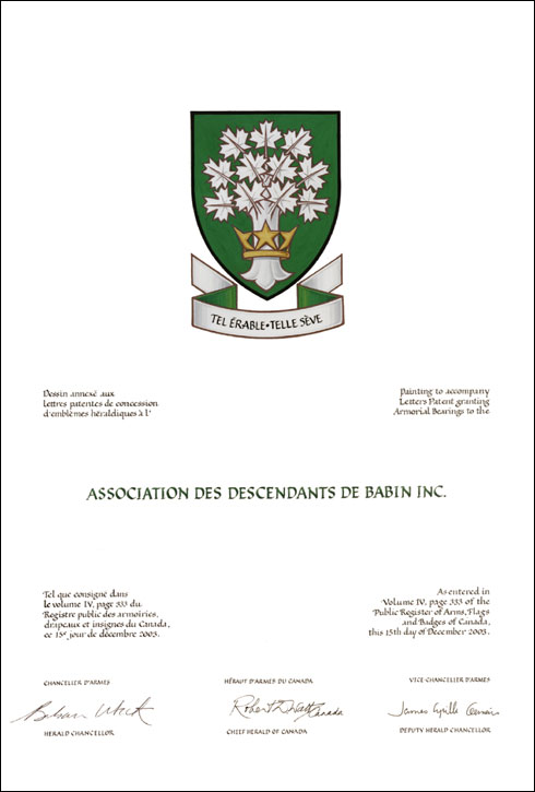 Arms of the Association des descendants de Babin Inc.BlazonVert a maple tree Argent enfiling a coronet of mullets Or; SymbolismThe maple tree symbolizes Canada and its leaves the eleven children of the pioneer couple Antoine Babin and Marie Mercier, who married in Port-Royal circa 1662. Antoine Babin arrived in Acadia from France circa 1654. Four boys and seven daughters were born of this union. Antoine Babin was designated as a farm labourer, hence the choice of green as the main colour of the shield. The star is the chief symbol of Acadia and, forming a crown, evokes Acadia's Port-Royal. |
