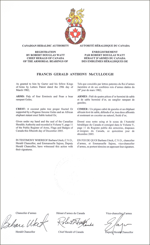 Armoiries de Francis Gerald Anthony McCulloughBlasonPalé de quatre pièces d’or herminé de sable et de sable herminé d’or, au sanglier rampant de gueules; SymbolismeSans objet |