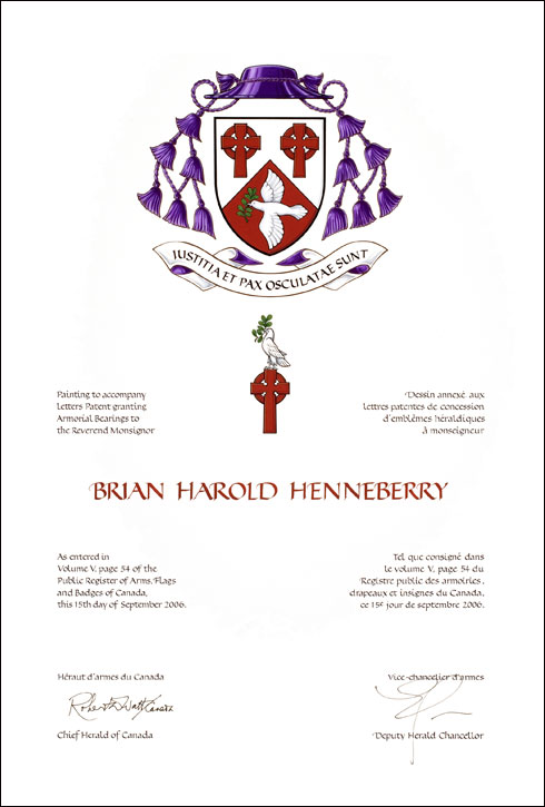 Armoiries de Brian Harold HenneberryBlasonDivisé en chevron d’argent sur gueules, en chef deux croix celtiques du même, en pointe une colombe volante d’argent tenant dans son bec un rameau d’olivier de sinople; SymbolismeLa division en chevron s’inspire des armoiries de la St. Thomas University à Fredericton, où Monseigneur Henneberry enseigne, et de celles de l’Université du Nouveau-Brunswick, d’où il a reçu son premier diplôme. Les croix celtiques représentent sa vocation de prêtre et son ascendance irlandaise. La colombe provient de l’emblème du diocèse de Saint John dont Monseigneur Henneberry est le vicaire général. |