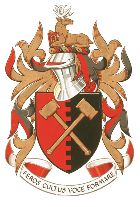 CimierBlasonUn cerf couché regardant d’or, ramé et onglé d’argent, tenant entre ses pattes un livre fermé de gueules chargé d’un ovale d’or surchargé d’une mitre de gueules; SymbolismeLe cerf est à la fois un meuble et un support des armoiries de Trinity College. Il provient des armoiries utilisées par le fondateur du collège, l’évêque Strachan, qui ont été différenciées au moment de la concession des armoiries au collège, en 1988, par la position de la tête du cerf et par la couleur blanche de ses bois et de ses sabots. Le livre rappelle l’aspect littéraire des activités de l’institut. La mitre d’évêque, qui figure sur le cimier du collège, évoque le Diocesan Theological Institute de Cobourg (Ontario), où le Literary Institute a été fondé dans les années 1840 en tant que société de débats. |