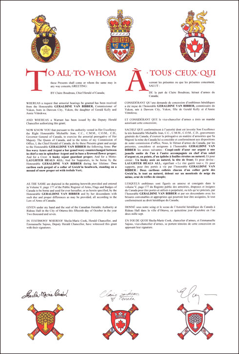 Informations additionnellesCréateur(s)Concept original de Darrel Kennedy, héraut Assiniboine, assisté par les hérauts de l’Autorité héraldique du Canada. Artiste-peintreCatherine Fitzpatrick CalligrapheShirley Mangione Type de récipiendaireIndividuel Statut spécialCommissaire territorial |