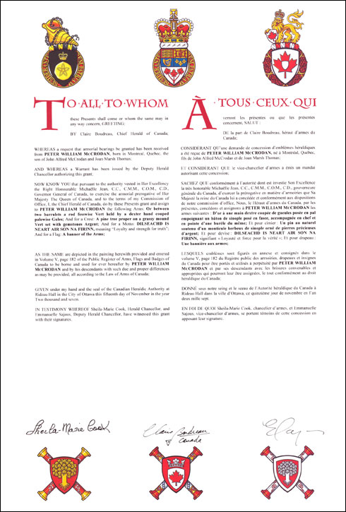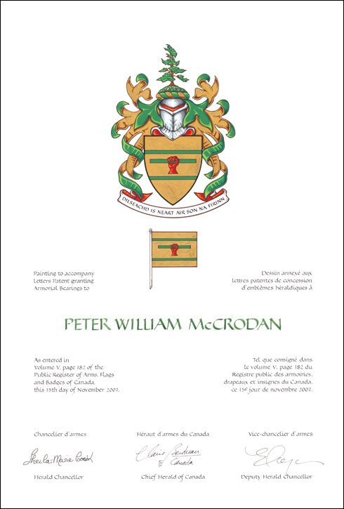 Armoiries de Peter William McCrodanBlasonD’or à une main dextre coupée de gueules posée en pal empoignant un bâton de sinople posé en fasce, accompagnée en chef et en pointe d’une burèle du même; SymbolismeLe champ doré et les bandes vertes sont inspirées des armoiries du comté de Donegal. Le bâton évoque le nom MacRodain, qui signifie « fort » et dont provient le nom McCrodan. Cette idée est accentuée par la main rouge soulevant le bâton. |