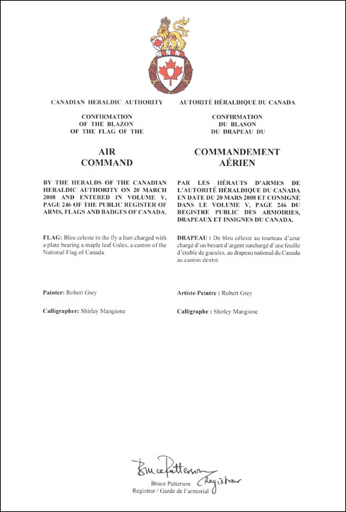 Drapeau du Commandement aérienBlasonDe bleu céleste au tourteau d’azur chargé d’un besant d’argent surchargé d’une feuille d’érable de gueules, au drapeau national du Canada au canton dextre; SymbolismeLe drapeau représenté ici a été sélectionné avec 14 autres drapeaux pour figurer sur une affiche patrimoniale montrant une sélection de drapeaux militaires du Canada. Il est soit encore utilisé, soit historique en ce sens qu’il a été en usage sur les territoires qui forment le Canada d’aujourd’hui. Ces quinze propositions de drapeaux, sélectionnées parmi des dizaines d’autres pour leur variété, n’ont pas de symbolisme écrit. |