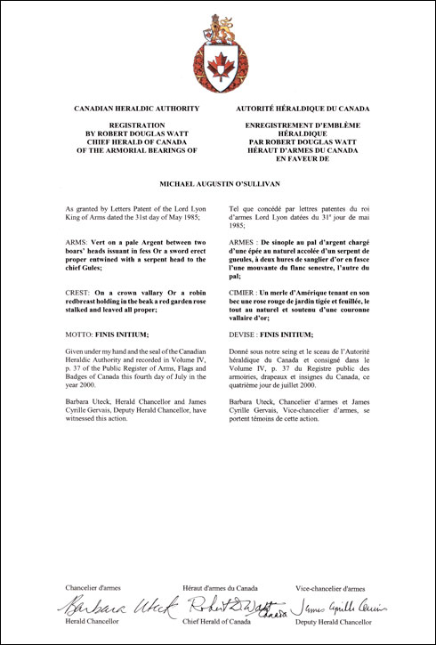 Armoiries de Michael Augustin O'SullivanBlasonDe sinople au pal d'argent chargé d'une épée au naturel accolée d'un serpent de gueules, à deux hures de sanglier d'or en fasce l'une mouvante du flanc senestre, l'autre du pal; SymbolismeNon disponible. |