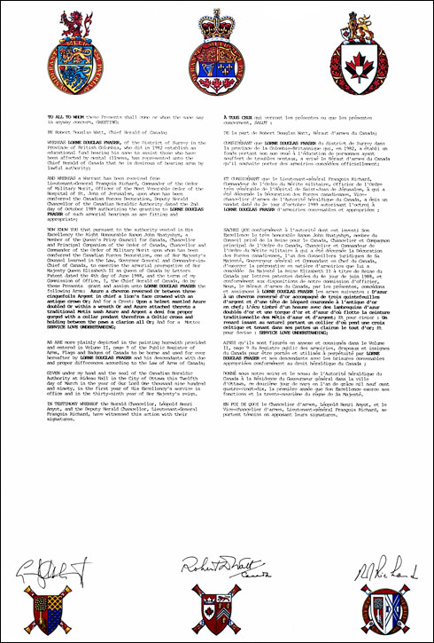 Informations additionnellesCréateur(s)Concept original de Charles Maier, héraut Athabaska, assisté par les hérauts de l'Autorité héraldique du Canada. Artiste-peintreJoan Ouellette CalligrapheNancy Ellis Type de récipiendaireIndividuel |