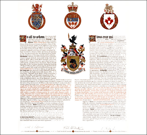 Informations additionnellesCréateur(s)Concept original de John Edwin Ruch, assisté par les hérauts de l’Autorité héraldique du Canada. Artiste-peintreDonald Hallman CalligrapheJudith Bainbridge Type de récipiendaireIndividuel |
