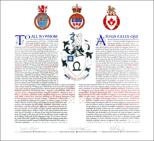 Informations additionnellesCréateur(s)Concept original de Robert D. Watt, héraut d'armes du Canada, assisté par les hérauts de l’Autorité héraldique du Canada. Artiste-peintreJudith Bainbridge CalligrapheJudith Bainbridge Type de récipiendaireIndividuel |