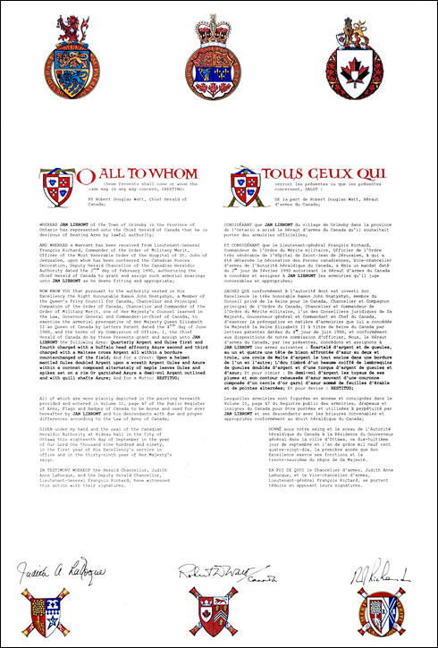 Informations additionnellesCréateur(s)Concept original de Jan Libront et de Robert D. Watt, héraut d'armes du Canada, assistés par les hérauts de l'Autorité héraldique du Canada. Artiste-peintreHans Birk CalligrapheJudith Bainbridge Type de récipiendaireIndividuel |