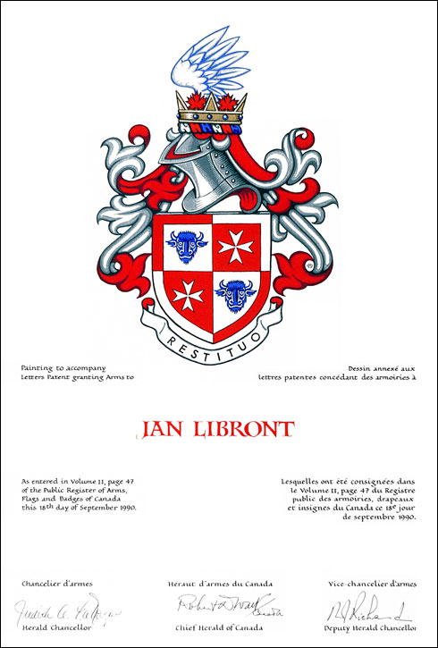Armoiries de Jan LibrontBlasonÉcartelé d'argent et de gueules, aux un et quatre une tête de bison affrontée d'azur aux deux et trois, une croix de Malte d'argent le tout enclos dans une bordure de l'un en l'autre; |