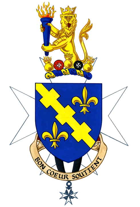 CimierBlasonUn cercle de grenades de guerre allumées au naturel alternant avec des tourteaux de gueules et des tourteaux de sable, chaque tourteau chargé d'une croix de Malte d'argent, le tout sommé d'un demi-léopard-lionné coiffé d'une couronne fleurdelisée d'or et tenant dans ses pattes un flambeau d'azur allumé au naturel; |