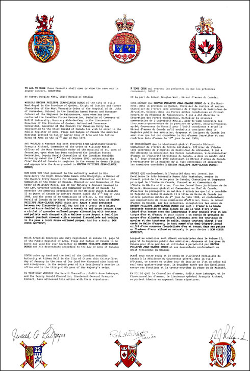 L'utilisation du contenu du Registre public est réservée à des fins de recherche uniquement. Les emblèmes héraldiques du Registre ne peuvent être reproduits sous aucune forme ou par quelque procédé que ce soit sans l'autorisation écrite de l'Autorité héraldique du Canada et/ou du récipiendaire.