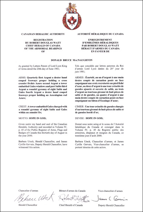 Armoiries de Donald Bruce MacNaughtonBlasonÉcartelé, au un d'argent à une main dextre coupée de carnation posée en face empoignant une croix recroisetée au pied fiché d'azur, au deux d'argent à une tour crénelée de gueules ajourée et ouverte de sable, au trois d'argent au tourteau gironné de huit pièces de sable et de gueules, au quatre d'argent à une main dextre coupée de carnation posée en face empoignant un bâton d'Esculape d'azur; SymbolismeNon disponible. |