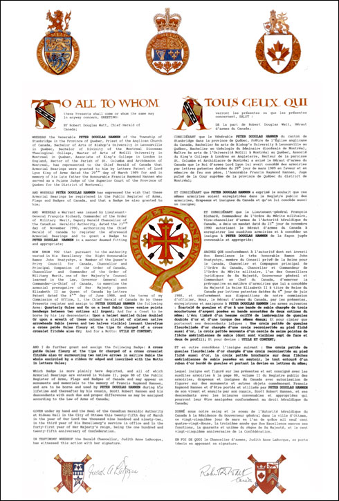 L'utilisation du contenu du Registre public est réservée à des fins de recherche uniquement. Les emblèmes héraldiques du Registre ne peuvent être reproduits sous aucune forme ou par quelque procédé que ce soit sans l'autorisation écrite de l'Autorité héraldique du Canada et/ou du récipiendaire.
