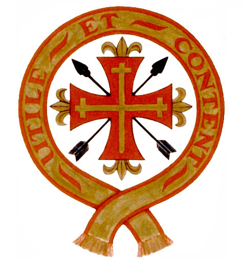 Insigne de Peter Douglas HannenBlasonUne croix pattée de gueules fleurdelisée d'or chargée d'une croix recroisettée au pied fiché aussi d'or, la croix pattée brochante sur deux flèches autochtones de sable passées en sautoir, le tout entouré d'un ruban d'or bordé de gueules et portant la devise en lettres du même; |