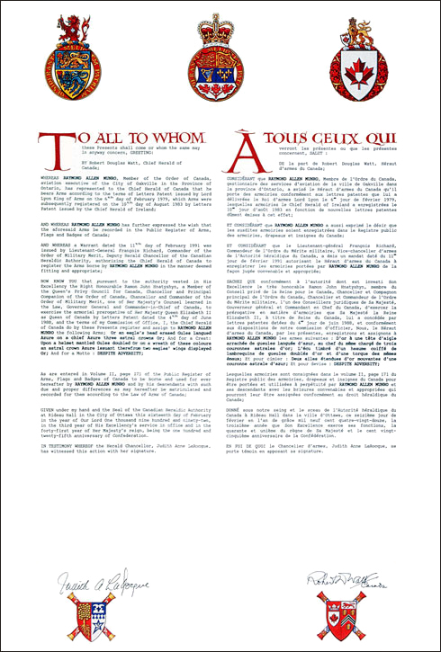 L'utilisation du contenu du Registre public est réservée à des fins de recherche uniquement. Les emblèmes héraldiques du Registre ne peuvent être reproduits sous aucune forme ou par quelque procédé que ce soit sans l'autorisation écrite de l'Autorité héraldique du Canada et/ou du récipiendaire.