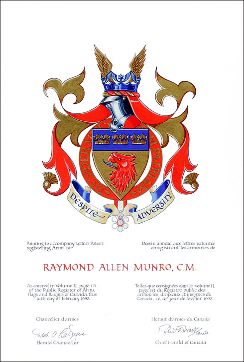 Armoiries de Raymond Allen MunroBlasonD'or à une tête d'aigle arrachée de gueules languée d'azur, au chef du même chargé de trois couronnes astrales d'or; |