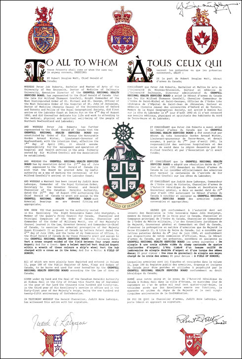 Armoiries du Grenfell Regional Health Services BoardBlasonDe sinople à une croix alésée vidée du champ cantonnée de quatre claricordes d'argent; |
