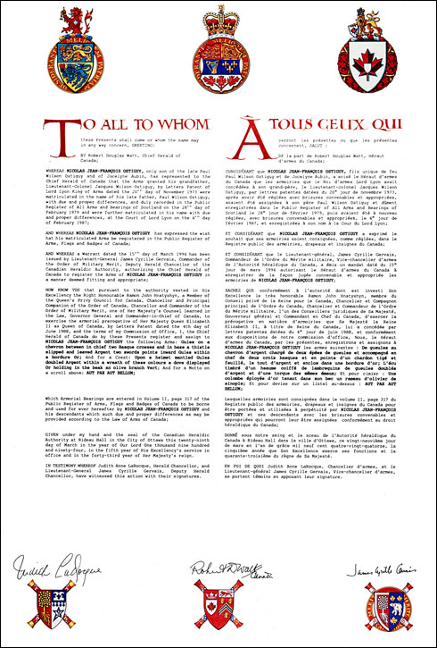 Armoiries de Nicolas Jean-François OstiguyBlasonDe gueules au chevron d'argent chargé de deux épées de gueules et accompagné en chef de deux croix basques et en pointe d'un chardon tigé et feuillé, le tout d'argent et enclos dans une bordure d'or; |