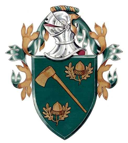 Armoiries de Joseph Patrice Daniel CognéBlasonDe sinople, à une cognée posée en bande accompagnée de deux rameaux de chênes à deux feuilles englantés d'or; SymbolismeLa hache, ou cognée, illustre le nom de famille Cogné. Les glands de chêne rendent hommage à sa mère, née Boucher de Grosbois, dont les armoiries familiales traditionnelles comportent aussi des éléments associés au chêne |