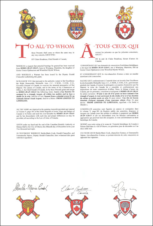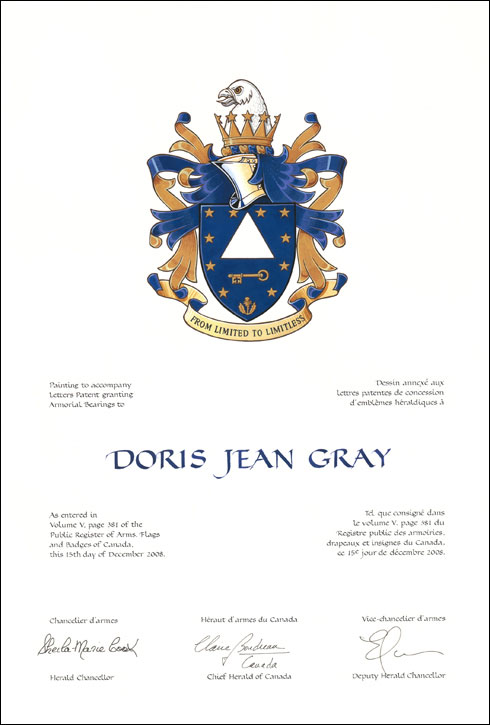 Armoiries de Doris Jean GrayBlasonD’azur à une clé d’or posée en fasce sommée d’un triangle d’argent, le tout environné de dix étoiles d’or et d’un chardon du même en pointe posés en orle; SymbolismeLe champ bleu représente l’infini. Les trois pointes du triangle symbolisent le physique, l’intellect et le spirituel. Le chardon honore le patrimoine écossais des ancêtres maternels de Mme Gray. La clé symbolise le savoir. Les dix étoiles représentent ses dix descendants. |