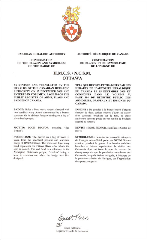 Insigne du N.C.S.M. OttawaBlasonDe gueules à la bande ondée d’argent chargée de deux cotices ondées d’azur, au castor d’or couchant brochant sur le tout, sa patte antérieure senestre posée sur un rondin de bouleau argenté au naturel; SymbolismeLe castor sur un rondin est repris de l’insigne non-officiel porté par le NCSM Ottawa avant et pendant la guerre. Les bandes ondulées blanches et bleues représentent la rivière des Outaouais ( Ottawa River en anglais) qui a donné son nom au navire. Le champ rouge évoque la population autochtone des Outaouais, lesquels étaient désignés, à l’époque de la première création de l’insigne, par l’appellation de « peaux-rouges ». |