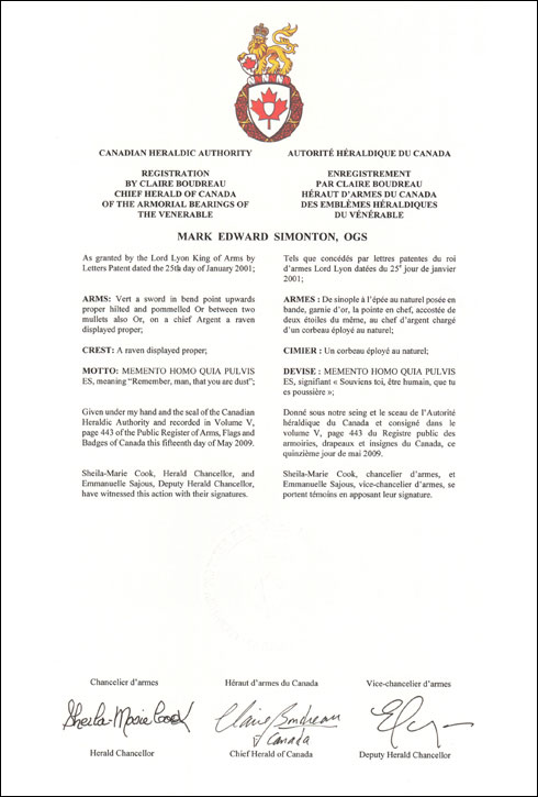 Informations additionnellesCréateur(s)Concept original de sir Malcolm Innes d’Edingight, roi d’armes Lord Lyon, et de Mark Edward Simonton. Artiste-peintreSans objet CalligrapheSans objet Type de récipiendaireIndividuel Autres renseignementsLes emblèmes du récipiendaire ont été précédemment consignés dans les archives de la Cour du Roi d’armes Lord Lyon, Édimbourg, Écosse, le 25 janvier 2001.