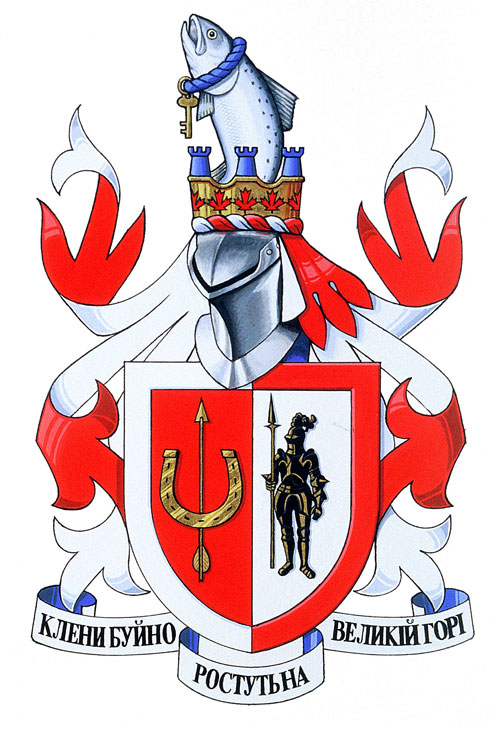 DeviseBlasonКЛЕНИ БУЙНО РОСТУТЬНА ВЕЛИКІЙ ГОРІ. Cette phrase ukrainienne signifie « Que les érables fleurissent sur la montagne ». |