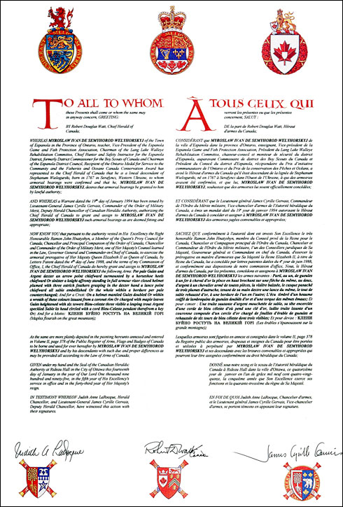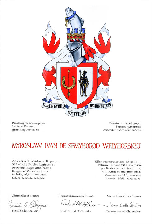 Armoiries de Myroslaw Ivan de Semyhorod WelyhorskyjBlasonParti, au un, de gueules à un fer à cheval d'or la pince en haut brochant sur une flèche du même, au deux, d'argent à un chevalier armé de toutes pièces, la visière baissée, le casque panaché de trois plumes d'autruche, tenant de sa main dextre une lance du même, le tout de sable rehaussé d'or, à une bordure de l'un en l'autre; |