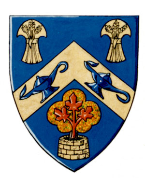 Armoiries de Marion Isabel CampbellBlasonD'azur à un chevron d'or chargé de deux lampes antiques d'azur accompagné en chef de deux gerbes de blé d'or et en pointe d'un érable paré de ses couleurs d'automne au naturel chargé d'un rameau de trois feuilles d'érable de gueules et mouvant d'un puits d'or maçonné de sable; |