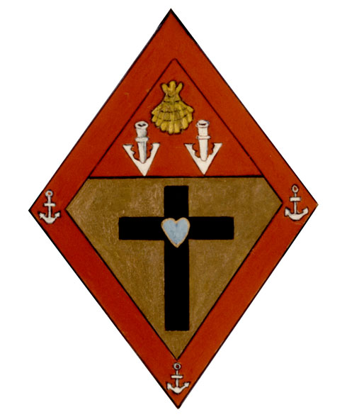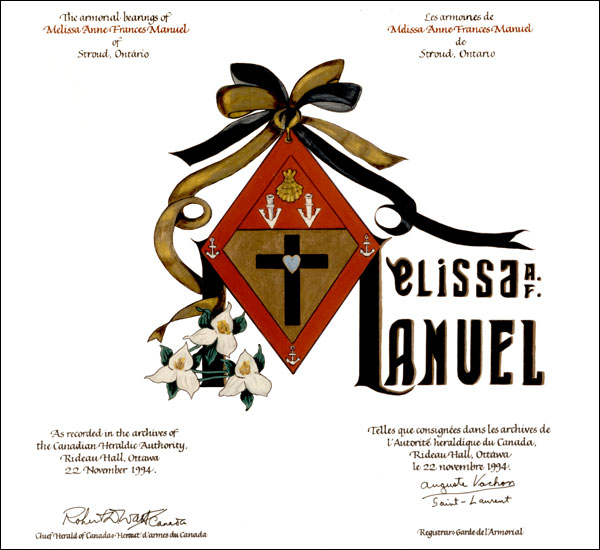 Armoiries brisées de Melissa Anne Frances Manuel, petite-fille de Terrence Charles ManuelBlasonLes armoiries de Terrence Charles Manuel [D'or à la croix de la Passion de sable, au chef de gueules chargé d'une coquille d'or accostée de deux phéons d'argent les pointes en bas le tout enclos dans une bordure de gueules chargée de trois ancres en pal d'argent] brisées d'un coeur d'azur; |