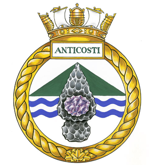Insigne du NCSM AnticostiBlasonCoupé, au un divisé en chevron d'argent sur sinople, au deux d'argent à deux burèles ondées d'azur en chef et bronchante sur le coupé une pointe de lance autochtone en silex chargée d'une améthyste au naturel; |