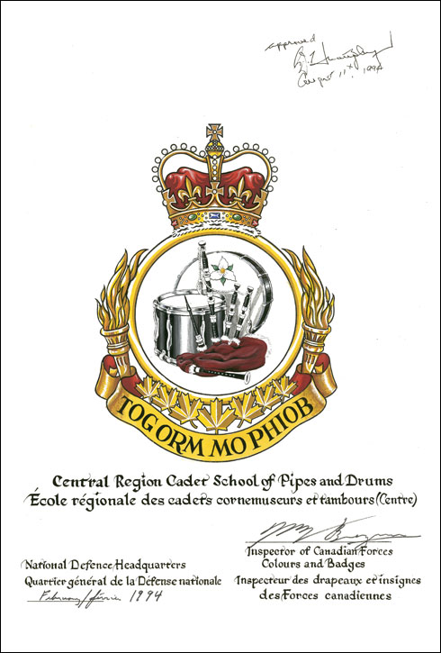 Insigne de l'École régionale des cadets cornemuseurs et tambours (Centre)BlasonD'argent à une grosse caisse chargée d'un trille et accompagnée d'une caisse roulante et d'une cornemuse brochante brochante, le tout au naturel; |