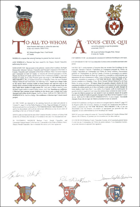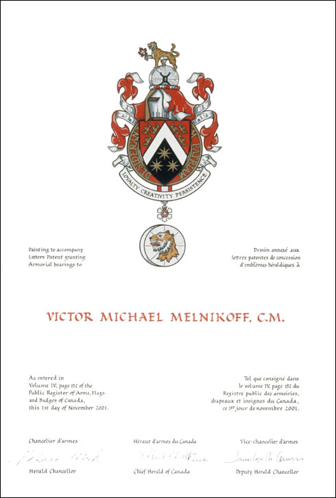 Armoiries de Victor Michael MelnikoffBlasonD'argent chapé de gueules chargé à dextre de trois couronnes érablées d'or posées un et deux en barre et à senestre de trois couronnes érablées du même posées un et deux en bande, à une pointe de sable chargée de trois étoiles à huit rais d'or; SymbolismeLa figure en V suggére la profession d’avocat de M. Melnikoff par sa ressemblance aux bandes du rabat que portent au cou les avocats. Les couronnes posées en parallèle au V rappellent les armes d’Alsace, région d’origine de la mère et de l’épouse de M. Melnikoff. Les couronnes comportent une dimension canadienne par l’inclusion de feuilles d’érable. Le rouge et l’or sont les couleurs d’Alsace alors que le noir et blanc sont les couleurs de la robe des légistes. Les étoiles représentent le Gala des Étoiles que M. Melnikoff a mis sur pied pour la promotion des arts de la scène. |
