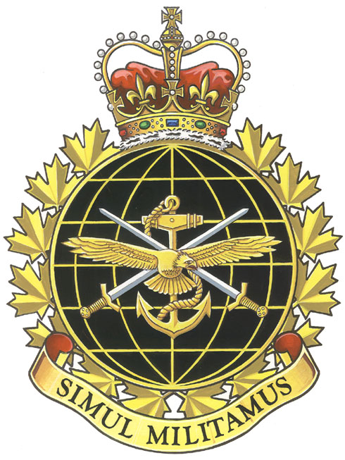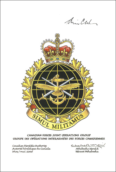 Insigne du Groupe des opérations interarmées des Forces canadiennesBlasonUn globe de sable marqué de latitudes et de longitudes d'or, chargé d'une ancre munie d'une gumène le tout du même, surchargé de deux épées de croisé d'argent garnies d'or passées en sautoir, à une aigle volante de front du même brochante sur le tout, sa tête tournée vers senestre; SymbolismeLe globe représente le contexte mondial dans lequel le Groupe doit être prêt à effectuer des opérations. L'ancre, les épées et l'aigle représentent le fait que les opérations coordonnées par le Groupe font appel aux forces combinées de la marine, de l'armée de terre et de l'armée de l'air. |