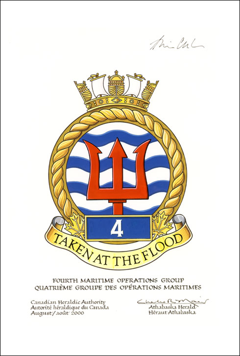 Insigne du Quatrième groupe des opérations maritimesBlasonBurelé-ondé d'argent et d'azur à la partie supérieure d'un trident de gueules mouvante de la pointe; SymbolismeL'insigne fait référence à la responsabilité du Groupe quant à son utilisation des forces navales à la protection de la côte Ouest du Canada. |
