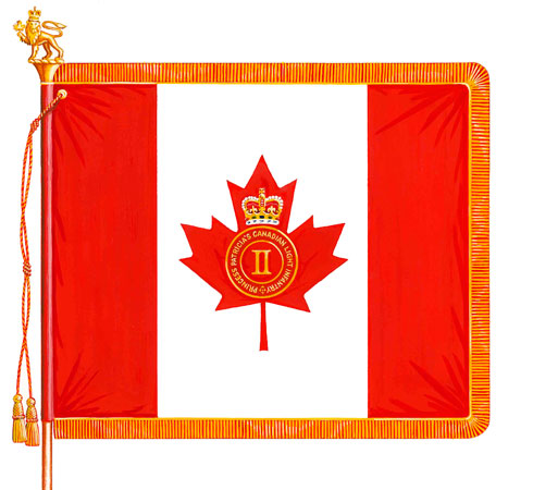 Drapeau royal du Princess Patricia’s Canadian Light InfantryBlasonDe gueules au pal canadien d’argent, à la feuille d’érable de gueules chargée des chiffres romains « II » d’or enclos dans un anneau de gueules liséré et inscrit PRINCESS PATRICIA’S CANADIAN LIGHT INFANTRY, le tout d’or et sommé de la couronne royale au naturel; SymbolismeRégiment d’infanterie, le Princess Patricia’s Canadian Light Infantry utilise comme drapeau royal le drapeau national du Canada avec l’ajout d’un anneau portant son nom sommé de la couronne royale. Le nombre « II » désigne le 2e Bataillon du régiment. |