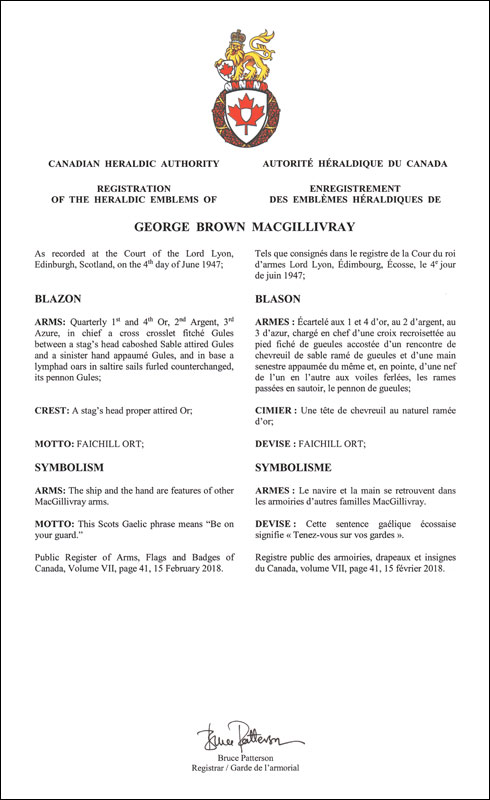 Armoiries de George Brown MacGillivrayBlasonÉcartelé aux 1 et 4 d’or, au 2 d’argent, au 3 d’azur, chargé en chef d’une croix recroisettée au pied fiché de gueules accostée d’un rencontre de chevreuil de sable ramé de gueules et d’une main senestre appaumée du même et, en pointe, d’une nef de l’un en l’autre aux voiles ferlées, les rames passées en sautoir, le pennon de gueules; SymbolismeLe navire et la main se retrouvent dans les armoiries d’autres familles MacGillivray. |
