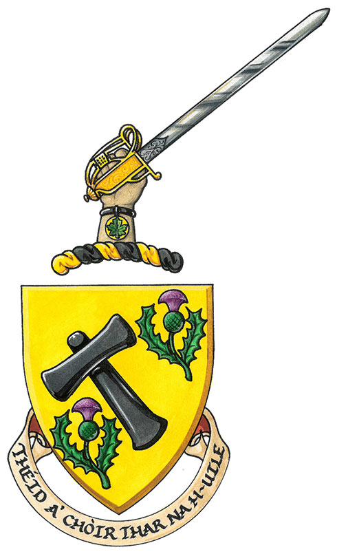 DeviseBlasonTHÉID A’ CHÒIR THAR NA H-UILE; SymbolismeSignifiant « La justice l’emportera sur tout », cette sentence en gaélique écossais est utilisée par d’autres familles McCorkell. |