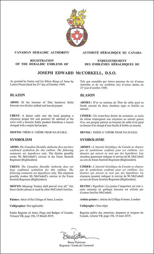 Armoiries de Joseph Edward McCorkellBlasonD’or au marteau de Thor de sable posé en bande accosté de deux chardons tigés et feuillés au naturel; SymbolismeL’Autorité héraldique du Canada ne dispose pas de symbolisme confirmé pour cet emblème. Les données qui suivent ne sont que des hypothèses. Les chardons pourraient indiquer le service de M. McCorkell au sein du Essex Scottish Regiment (Highlanders). |