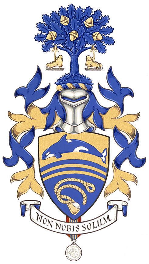 CimierBlasonUn chêne d’azur fruité d’or d’où pendent deux patins adossés du même les lames d’argent, le tout soutenu d’un monticule herbeux d’azur; SymbolismeLe chêne fait référence à l’emblème de l’ancien village de Forest Hill (littéralement « colline boisée ») et sa représentation sur une colline rappelle le nom de ce quartier de Toronto où M. Kosiner a grandi et qui lui est très cher. Les patins symbolisent l’équipement sportif distribué aux enfants défavorisés dans le cadre de la campagne nationale « les Patins de l’espoir », cofondée et présidée par M. Kosiner. Suspendus des deux côtés de l’arbre, ils évoquent l’image d’une balance et son rêve de justice pour toutes et tous. |