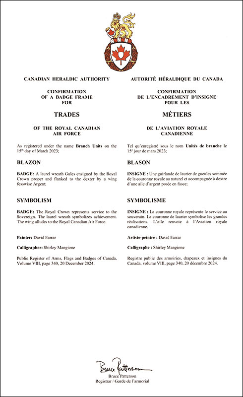 Informations additionnellesCréateur(s)Concept original du ministère de la Défense nationale. Artiste-peintreDavid Farrar CalligrapheSans objet Type de récipiendaireInstitution militaire Autres renseignementsLes emblèmes du récipiendaire ont été précédemment consignés sous le nom Unités de branche dans le Registre public des armoiries, drapeaux et insignes du Canada, volume VIII, page 155, le 15 mars 2023. |