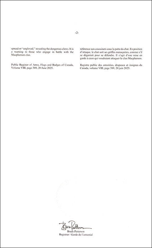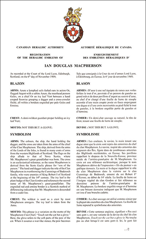 Armoiries d'Ian Douglas MacphersonBlasonD’azur à une nef équipée de rames aux voiles ferlées le tout d’or, pavoisée d’un pennon de gueules au grand mât et de deux pavillons d’argent au sautoir d’azur, au chef d’or chargé d’une feuille de lierre de sinople accostée d’une main coupée posée en fasce empoignant une dague et d’une croix recroisettée au pied fiché le tout de gueules, à la bordure engrêlée partie de gueules et d’hermine; SymbolismeLes couleurs, le navire, la main tenant une dague ainsi que la croix sont repris des armoiries du chef du clan Macpherson. Le navire, inspiré des armoiries des seigneurs des Îles, figure dans de nombreuses armoiries des Highlands occidentales, en Écosse. Ses pavillons rappellent le drapeau de la Nouvelle-Écosse, province natale de l’arrière-grand-père de M. Macpherson. La croix est une référence ecclésiastique, puisque le nom Macpherson dérive de l’expression « fils du pasteur » en gaélique écossais. La main et la dague rappellent le rôle du clan Macpherson dans la victoire sur le clan Cummings de Badenoch, ennemi du roi Robert Ier d’Écosse, au début du 14e siècle. La feuille de lierre est l’insigne végétal du clan Gordon et fait référence au deuxième prénom de l’arrière-grand-père de M. Macpherson. La bordure engrêlée rouge et d’hermine est une brisure écossaise indiquant que M. Macpherson est issu d’une branche cadette. |