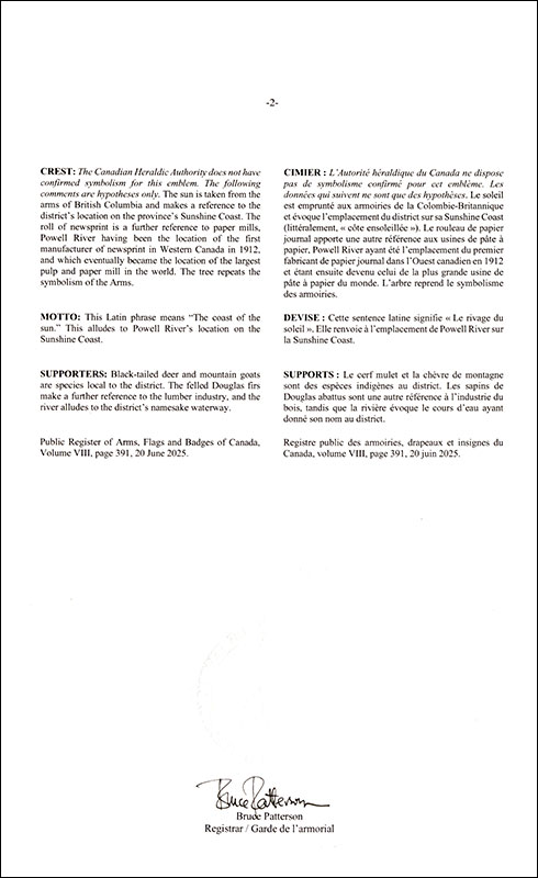 DeviseBlasonORA SOLIS; SymbolismeCette sentence latine signifie « Le rivage du soleil ». Elle renvoie à l’emplacement de Powell River sur la Sunshine Coast. |