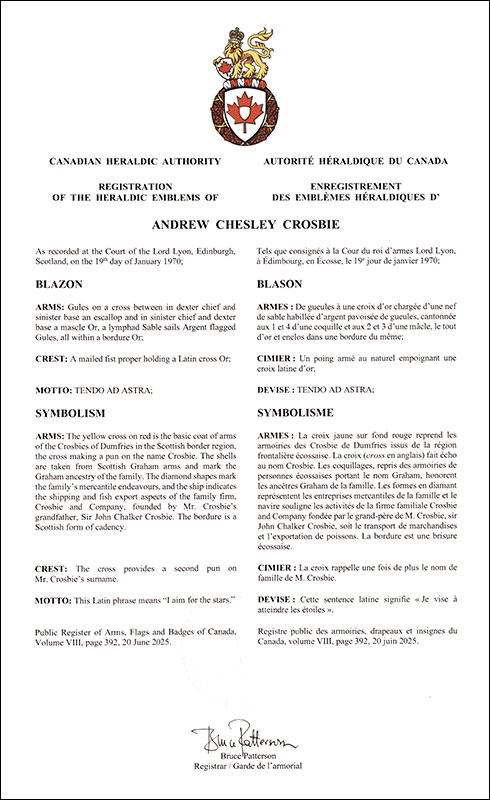 Informations additionnellesCréateur(s)Concept original de la Cour du roi d'armes Lord Lyon, Édimbourg. Artiste-peintreSans objet CalligrapheSans objet Type de récipiendaireIndividuel Autres renseignementsLes emblèmes du récipiendaire ont été précédemment consignés dans les archives de la Cour du roi d’armes Lord Lyon, à Édimbourg, en Écosse, le 19 janvier 1970. |