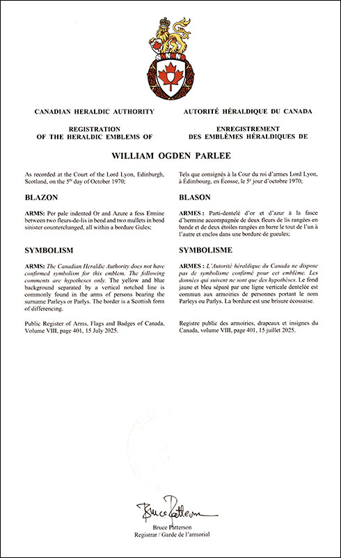 Armoiries de William Ogden ParleeBlasonParti-dentelé d’or et d’azur à la fasce d’hermine accompagnée de deux fleurs de lis rangées en bande et de deux étoiles rangées en barre le tout de l’un à l’autre et enclos dans une bordure de gueules; SymbolismeL’Autorité héraldique du Canada ne dispose pas de symbolisme confirmé pour cet emblème. Les données qui suivent ne sont que des hypothèses. Le fond jaune et bleu séparé par une ligne verticale dentelée est commun aux armoiries de personnes portant le nom Parleys ou Parlys. La bordure est une brisure écossaise. |