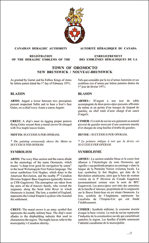 Armoiries de la Town of OromoctoBlasonD’argent à une tour de sable accompagnée de deux porcs-épics passants affrontés du même et en pointe d’un masque de léopard de gueules, au chef ondé d’azur chargé d’un canot d’argent; SymbolismeLa section ondulée bleue et le canot font allusion à l’étymologie du nom Oromocto, qui signifie « eau profonde propice au canotage » dans la langue de la Première Nation wolastoq locale. La tour symbolise le fort Hughes, qui date de la Révolution américaine, ainsi que la base de soutien voisine de la 5e Division du Canada Gagetown (communément connue sous le nom de BFC Gagetown). Les porcs-épics sont tirés des armoiries de la famille d’Amours, propriétaire de la seigneurie sur le fleuve Saint-Jean où est située Oromocto. Le lion, symbole de l’Angleterre, représente les Loyalistes de l'Empire-Uni qui ont fondé l’établissement. |