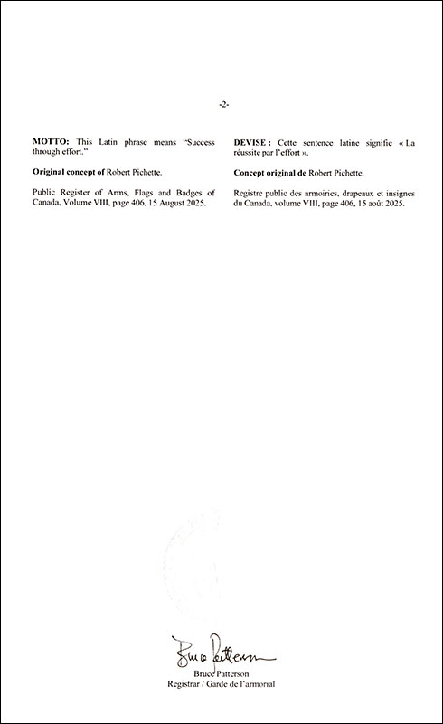 L'utilisation du contenu du Registre public est réservée à des fins de recherche uniquement. Les emblèmes héraldiques du Registre ne peuvent être reproduits sous aucune forme ou par quelque procédé que ce soit sans l'autorisation écrite de l'Autorité héraldique du Canada et/ou du récipiendaire.
