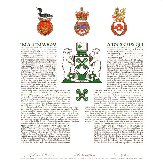Autres renseignementsLes emblèmes du récipiendaire ont été subséquemment consignés au nom d'Universités Canada dans le Registre public des armoiries, drapeaux et insignes du Canada, vol. VI, page 503, le 15 mai 2015. |