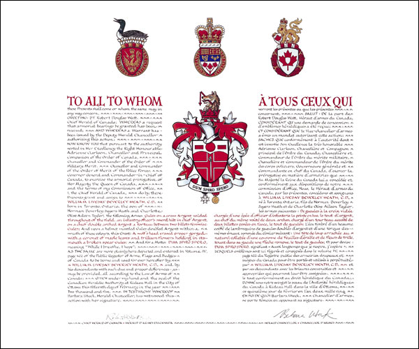 CimierBlasonUne tête de loup arrachée au naturel colletée d’une couronne de feuilles d’érable et de fleurs de trille, tenant dans sa gueule une flèche rompue, le tout de gueules; SymbolismeLa tête de loup est un symbole familial utilisé depuis des générations. Le loup représente la bonne humeur irrépressible de la famille Heath et sa joie de vivre – une énergie qui brise l’élan (représenté ici par la flèche cassée) de ceux qui voudraient s’y attaquer ou la diminuer. Toutefois, c’est une énergie « domptée » qui bénéficie à la communauté toute entière. Le collier est une couronne ontarienne, un élément qui figure sur l’écu du Royal Canadian Military Institute et qui a été choisi pour représenter, entre autres, le rôle joué par cet organisme dans la concession de ces armes. Le collier sert principalement à refléter les nombreuses années que les ancêtres de M. Heath ont consacrées au service public de la province du Haut-Canada, aujourd’hui l’Ontario, depuis 1836. |