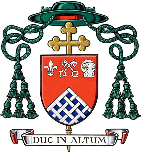 Armoiries de Robert Anthony DanielsBlasonDivisé en chevron cousu de gueules sur azur fretté d’argent, à deux clés passées en sautoir accostées d’une fleur de lis et d’une tête d’aigle nimbée, le tout en chef et d’argent; SymbolismeLe bleu, couleur associée à la Vierge Marie, rappelle la mer en eau profonde dont il est fait allusion dans la devise. Cette idée de jeter un filet dans la mer, une métaphore pour signifier le rassemblement des disciples, se reflète dans le motif qui imite un filet. La section en rouge rappelle le patrimoine anglo-gallois de l'évêque Daniels. Les clés sont les attributs traditionnels de saint Pierre et soulignent le fait que l'évêque Daniels a servi à la cathédrale St. Peter's, à London, avant de devenir membre de l'épiscopat. Le placement des clés au bout du filet est approprié, car Pierre était lui-même un pêcheur. La fleur de lis symbolise la sainte Vierge Marie, patronne principale du diocèse de London, tandis que l'aigle auréolé représente saint Jean l'évangéliste et rappelle que l'évêque Daniels a été ordonné le jour de la fête de saint Jean du Lateran. |